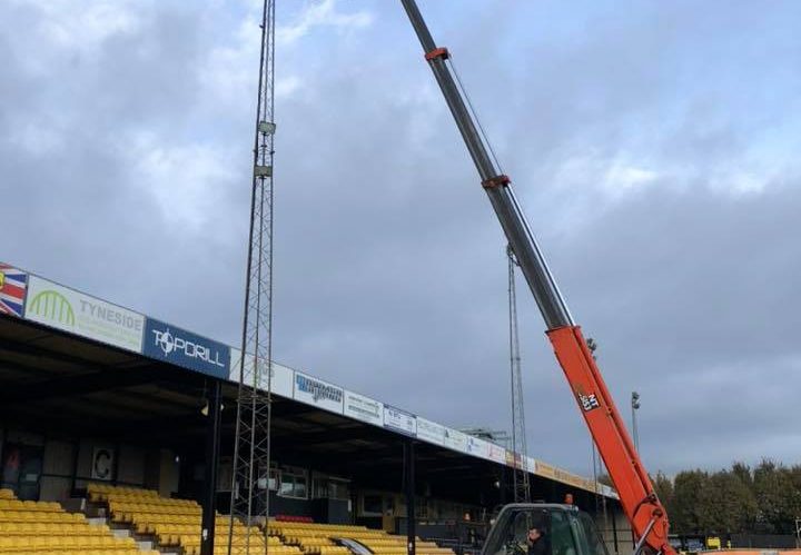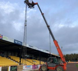 The main sponsor Michael Guthrie Developments supplying the lift…thankfully Neil has a head for heights #workingatheight #notforthefeinthearted #supportingbrfc